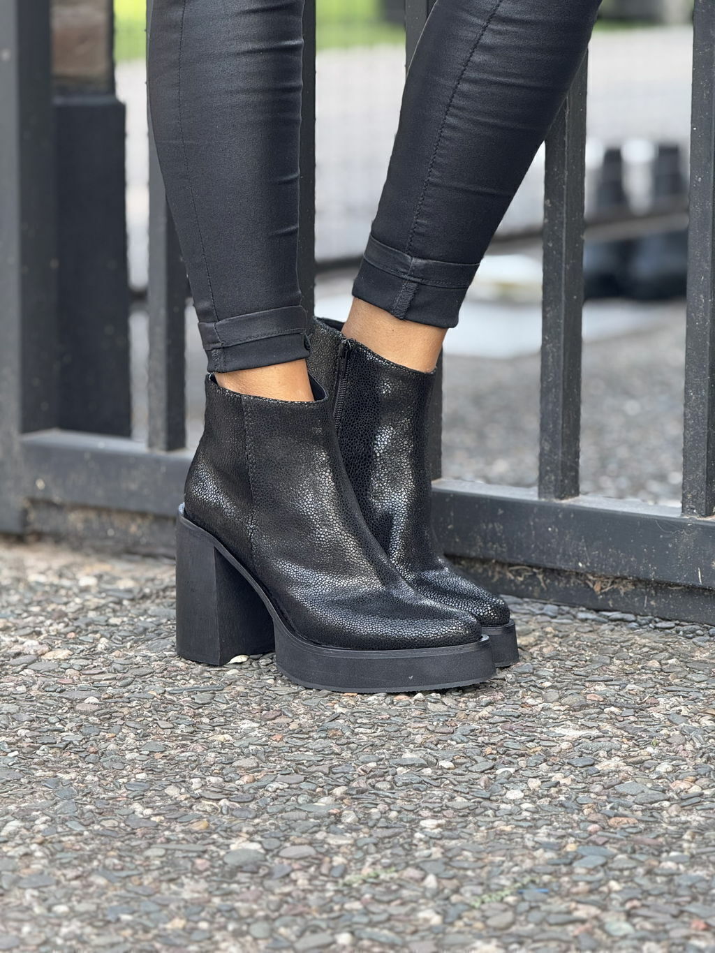 Bota 100% de cuero color negro transfer, con cierre lateral interno, plataforma y taco alto.
