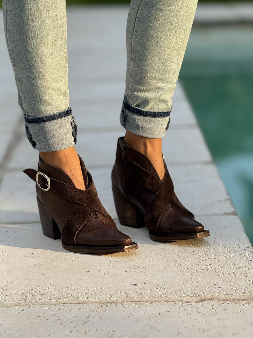 Botas100% de cuero genuino color chocolate con una tira cruzada y habilla metalica regulable.