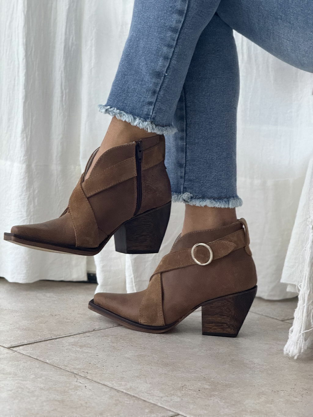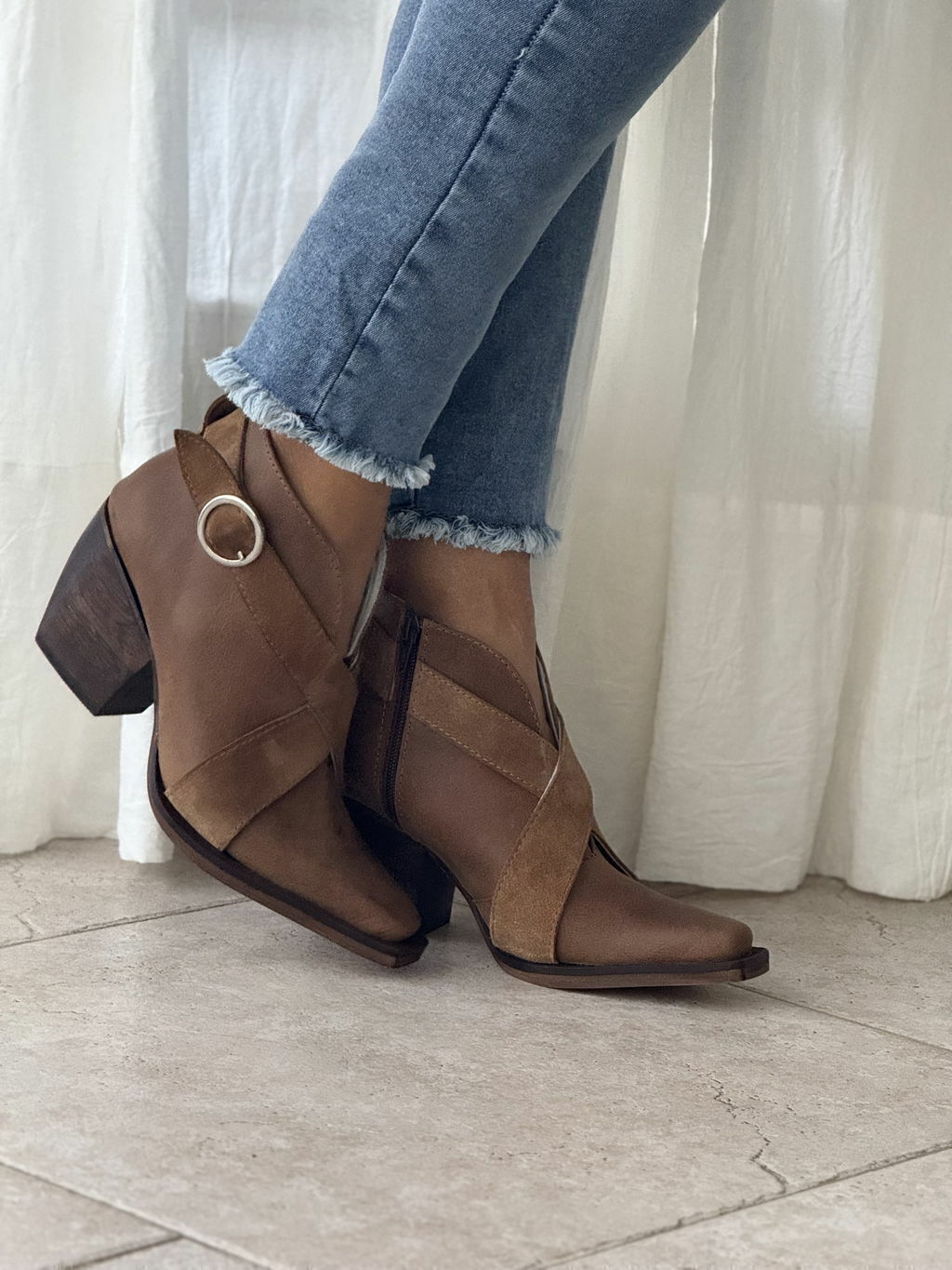Botas 100% de cuero genuino color marron con una tira cruzada y habilla metalica regulable.