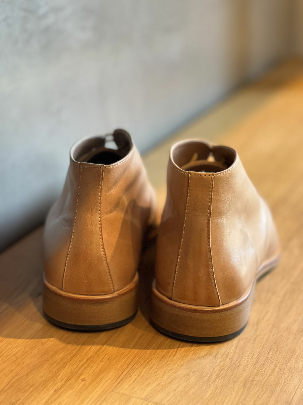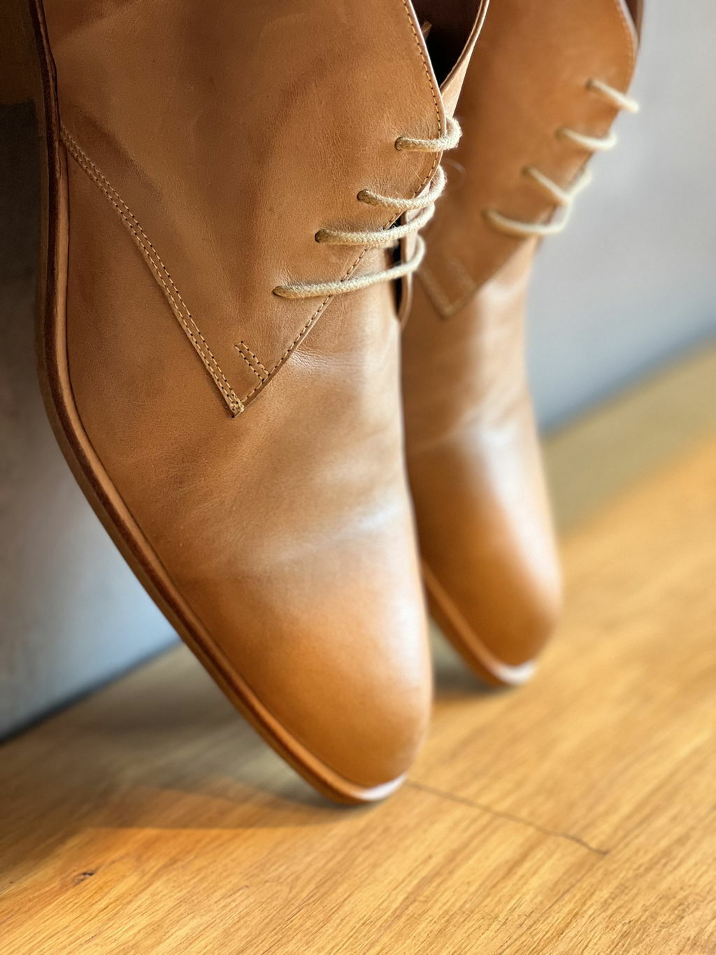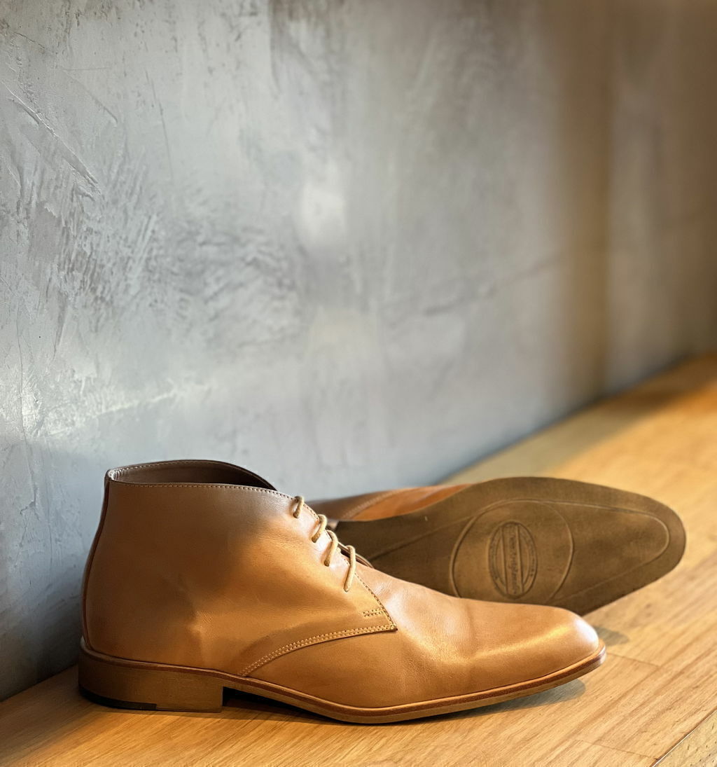 Zapatos botita de cuero color suela y fondo de suela al tono.