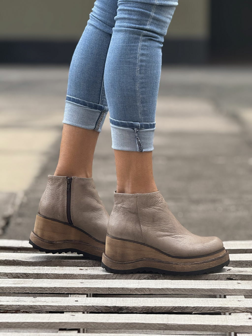 Bota urbana de caña baja 100% de cuero color vison y plataforma.