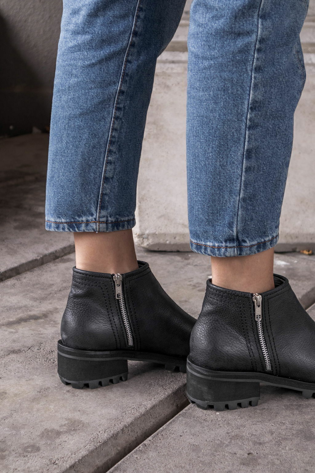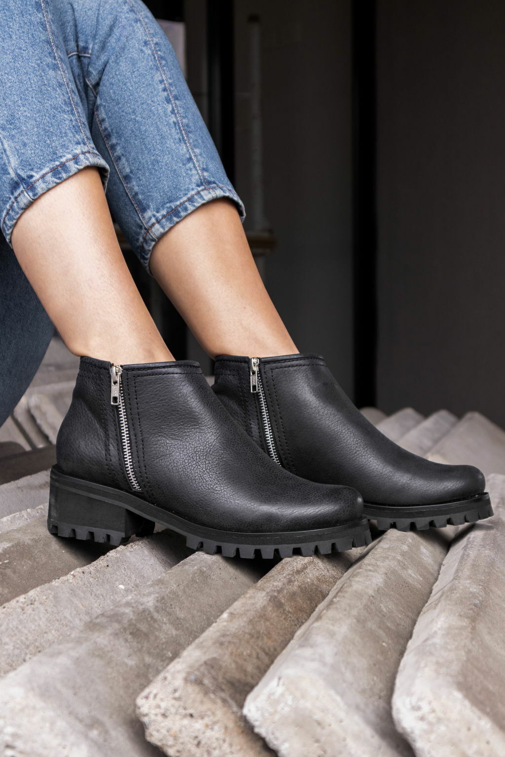 Bota 100% de cuero genuino color negro con doble cierre lateral y base de goma negra.