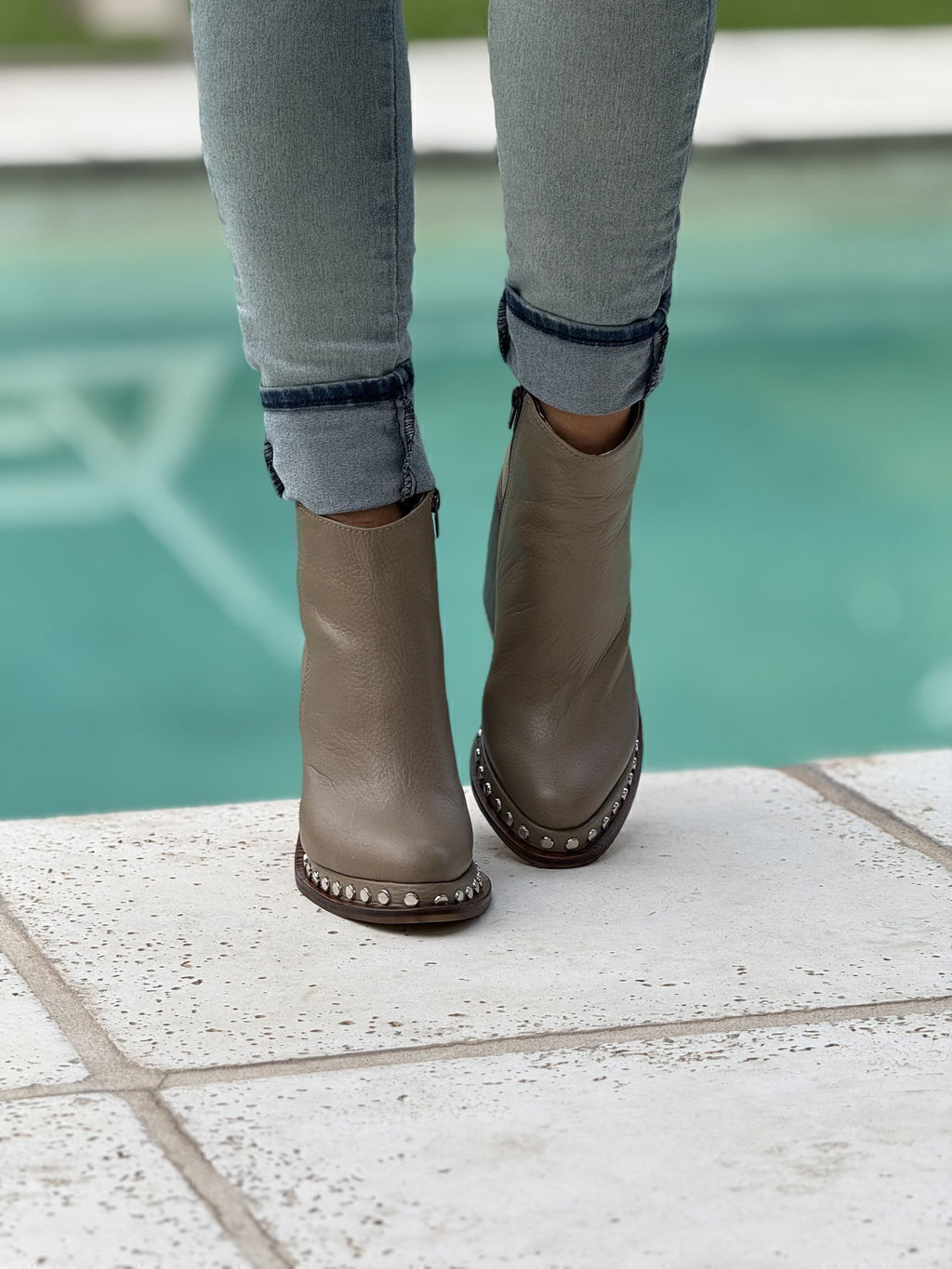 Bota 100% de cuero color vison, con cierre lateral interno y tachas en la suela.