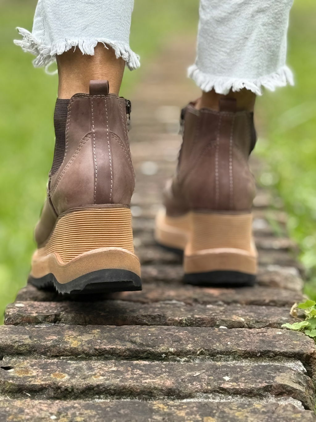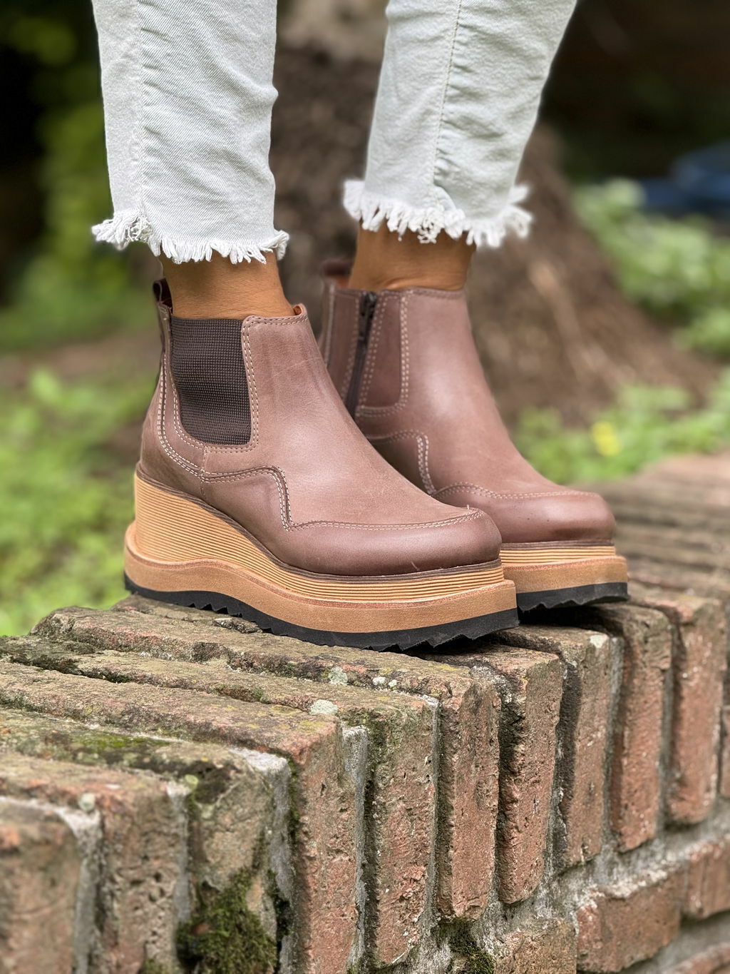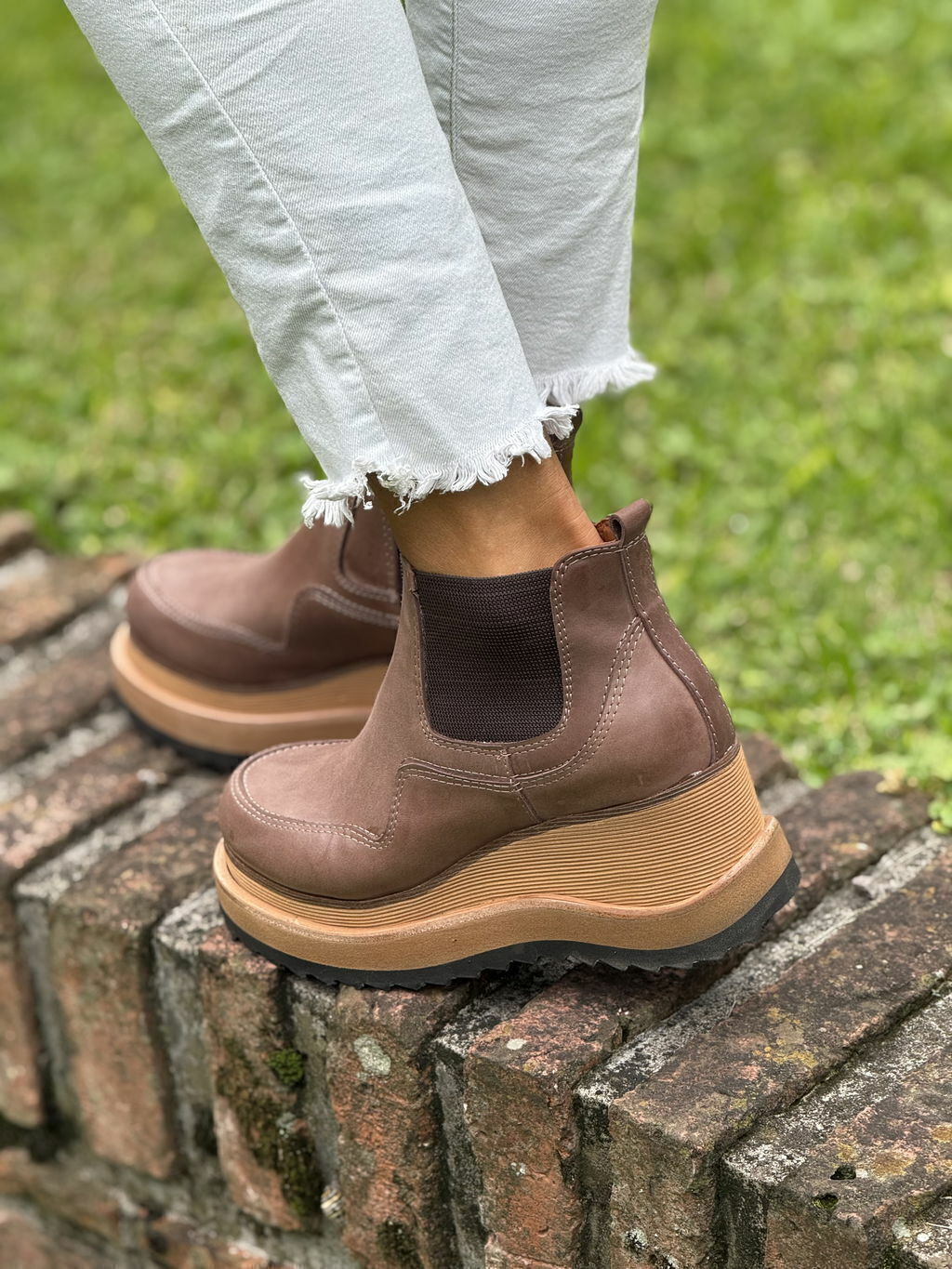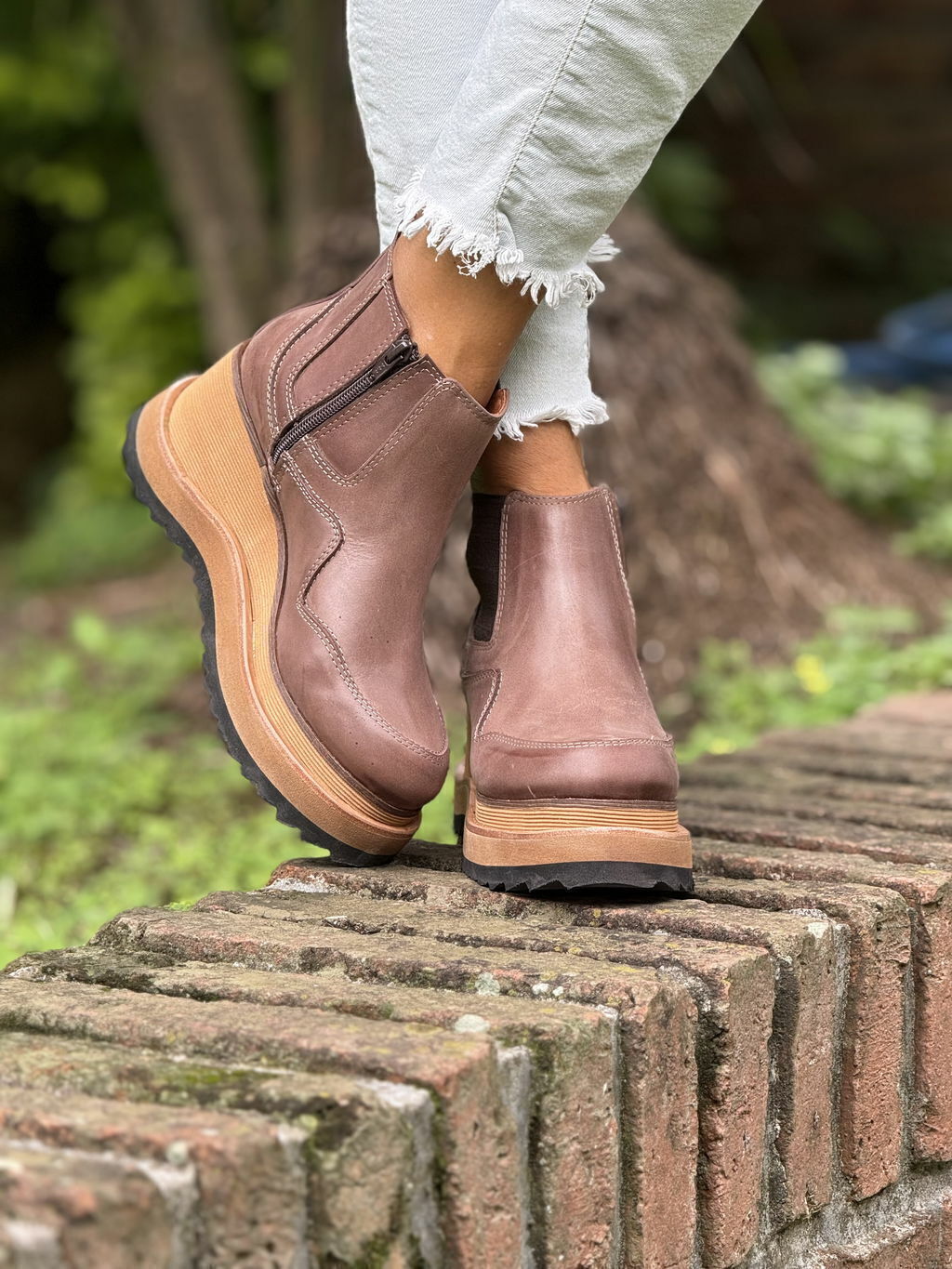 Botas elastizadas 100% de cuero genuino color marron, con cierre interno y plataforma de goma color suela con detalles negros.