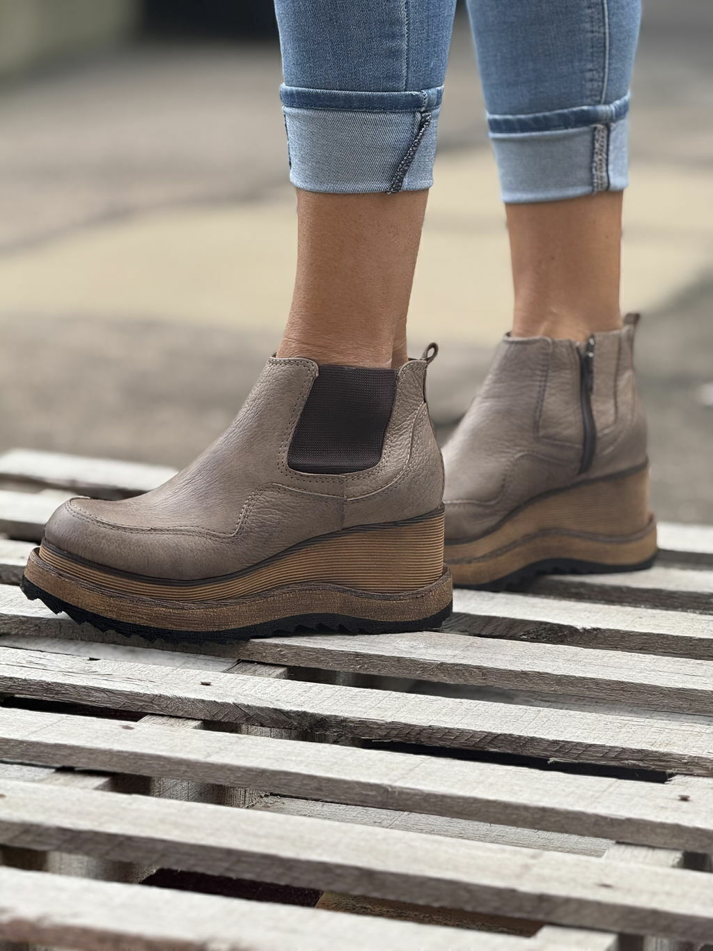 Botas elastizadas 100% de cuero genuino color vison, con cierre interno y plataforma de goma color marron con detalles negros.