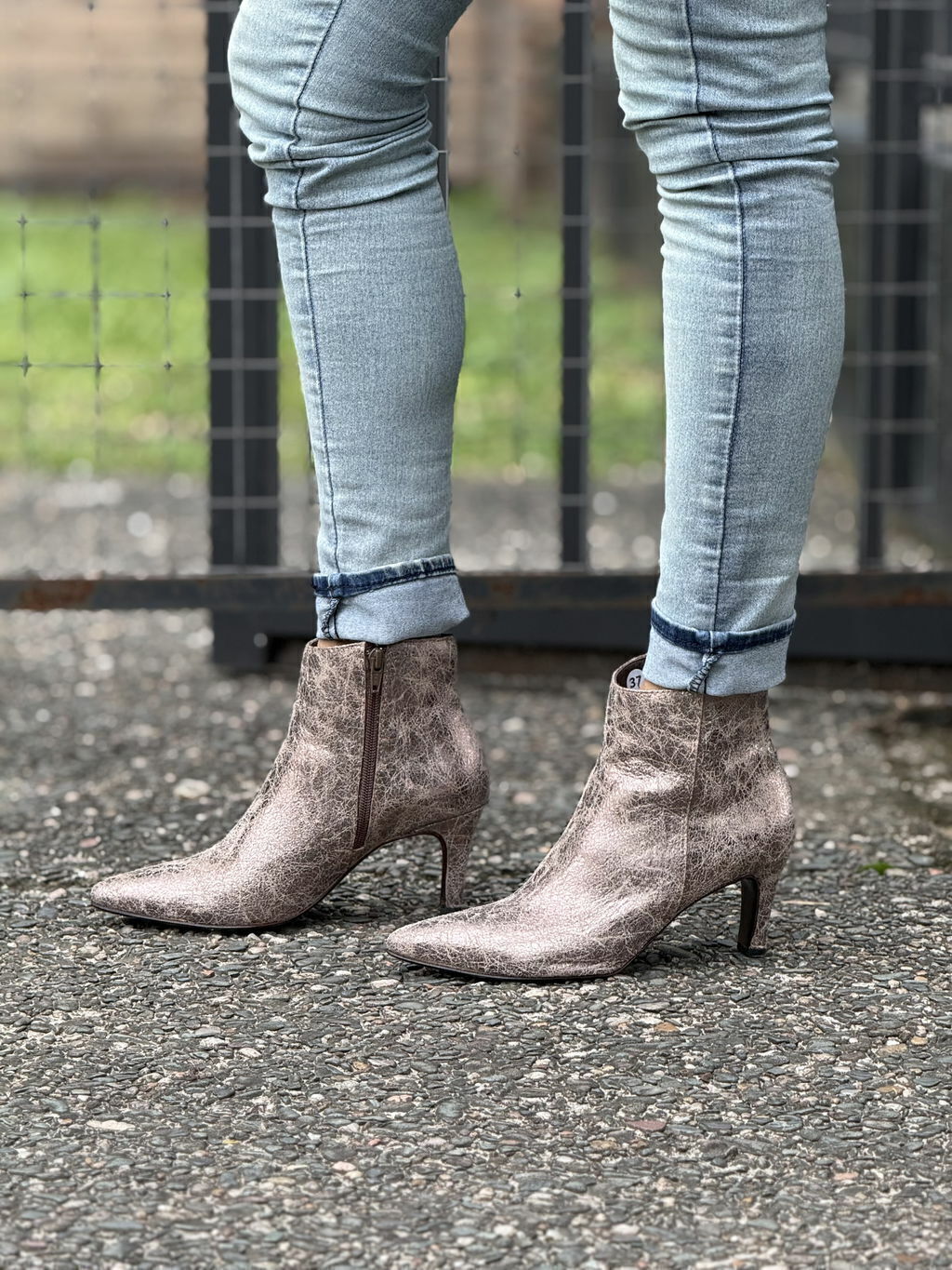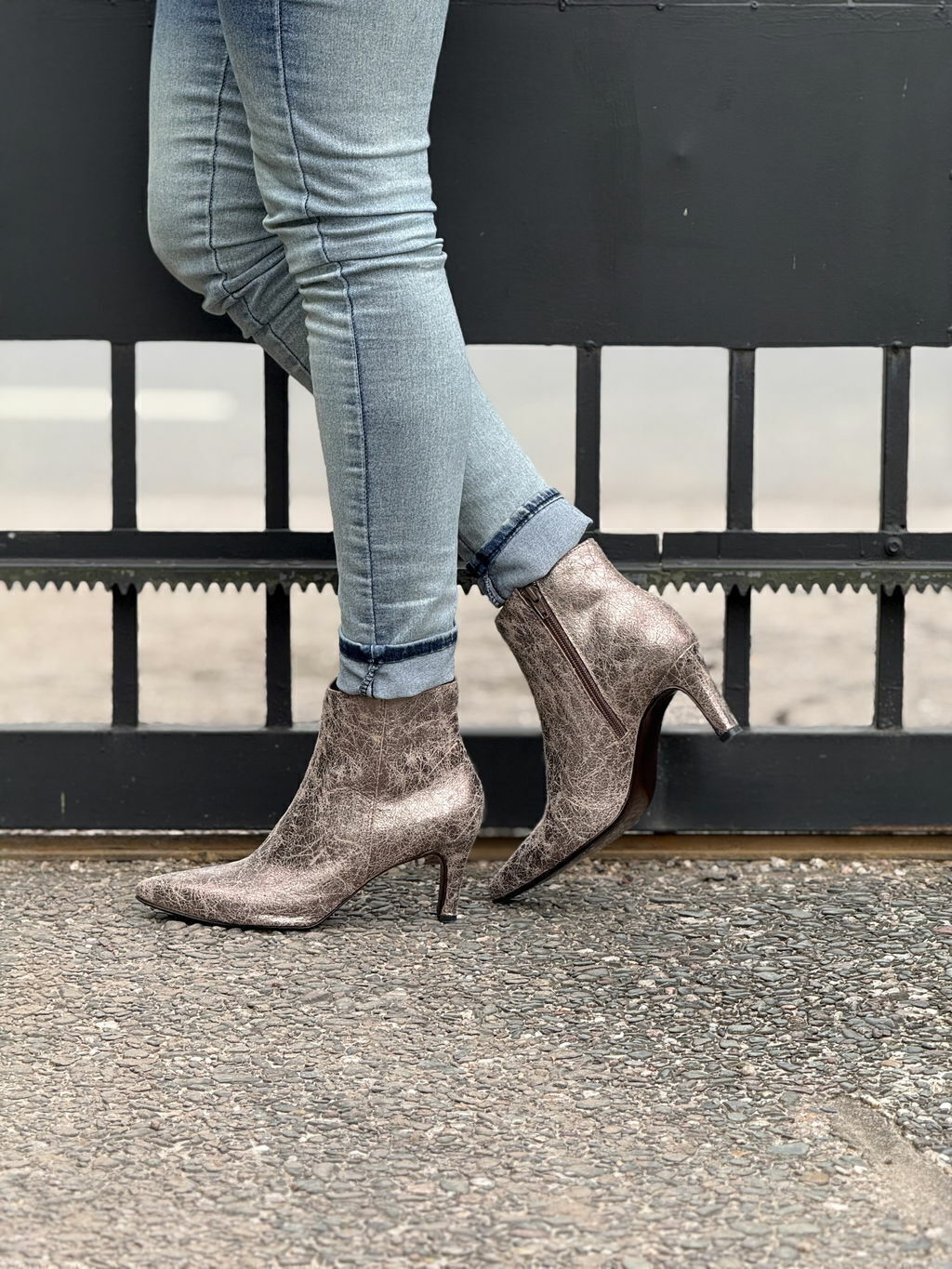 Botas stiletto bajas forradas en cuero y de color peltre multipunto.