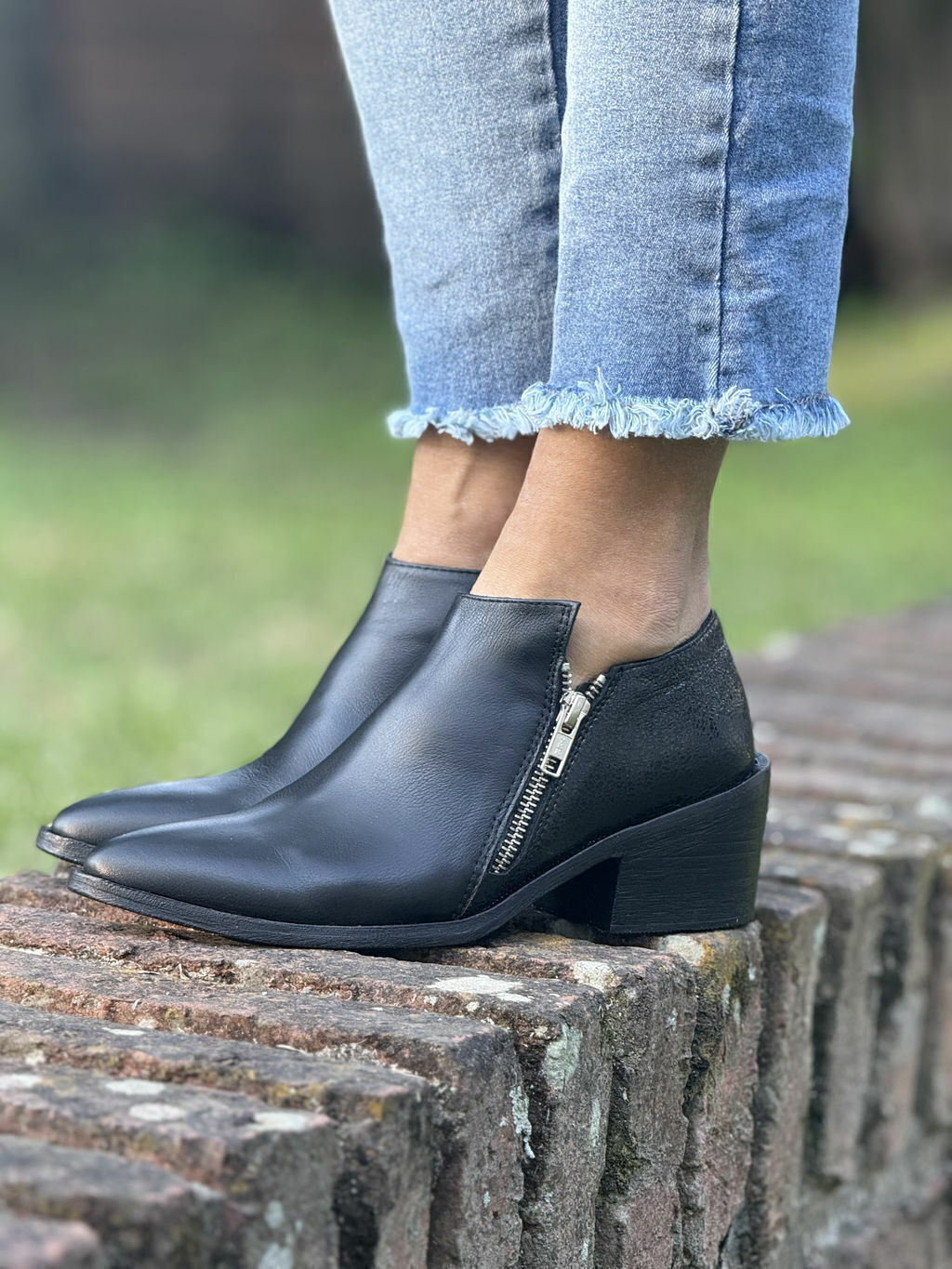 Bota de caña corta clasica de caña baja 100% de cuero color negro y transfer en la parte posterior, con un cierre lateral externo.