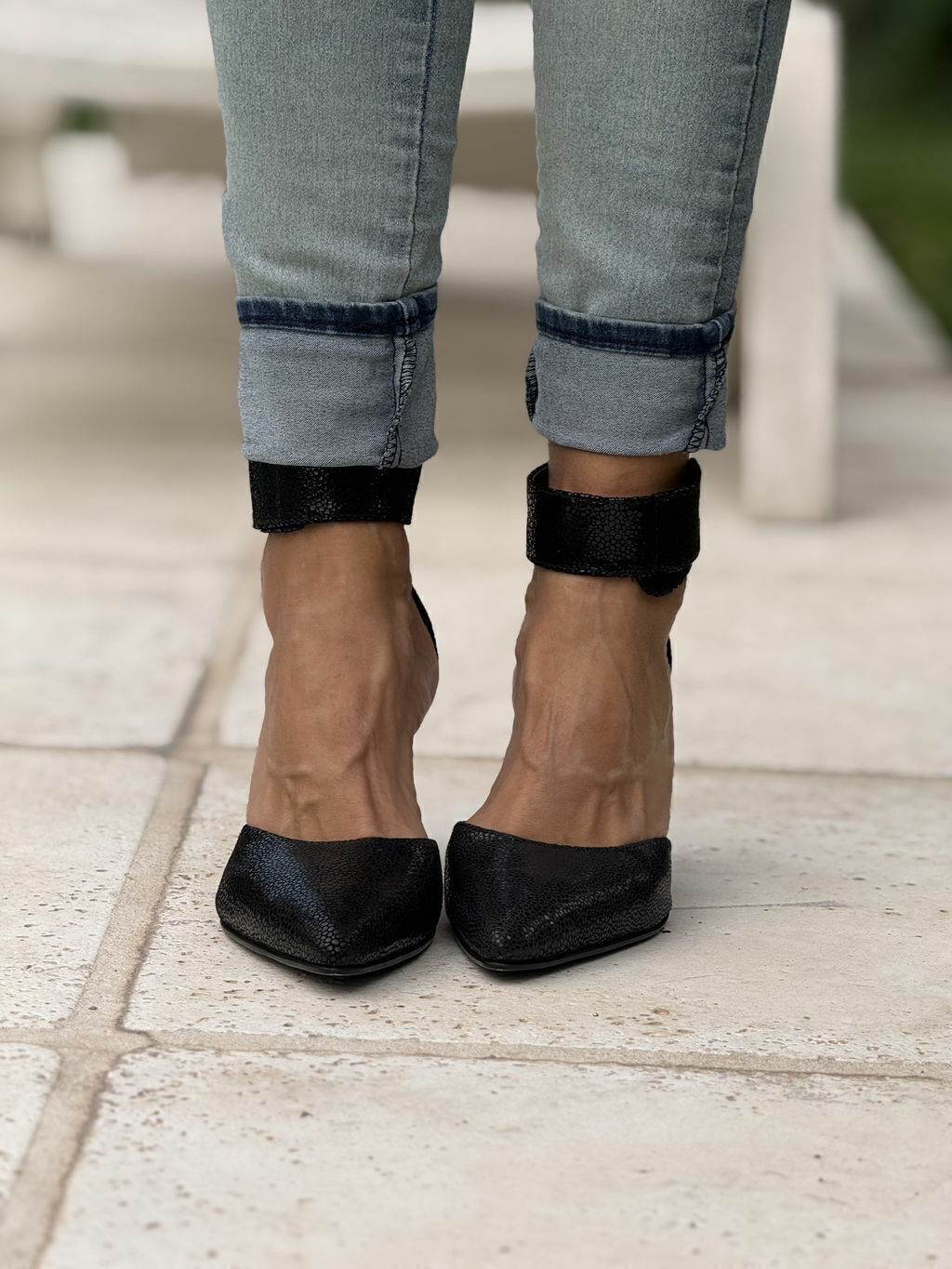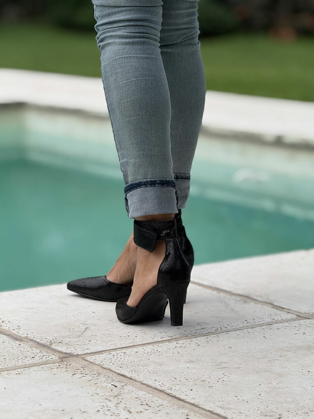 Stiletto de transfer negro, posee una talonera con pulsera y abrojo para mayor comodidad.