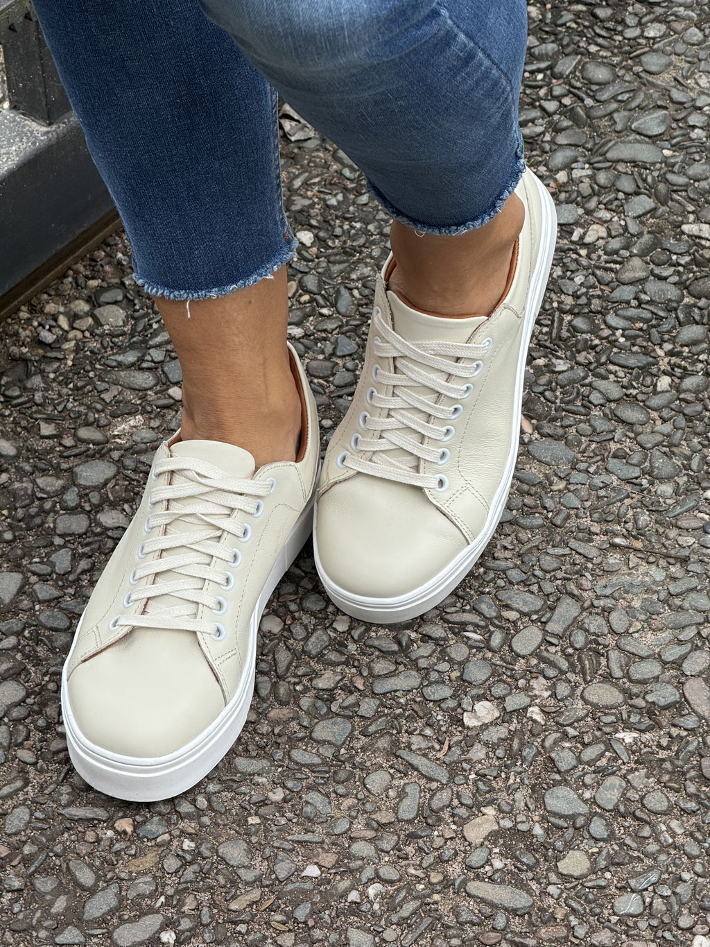 Zapatillas urbanas 100% de cuero genuino color crema y base de goma blanca.