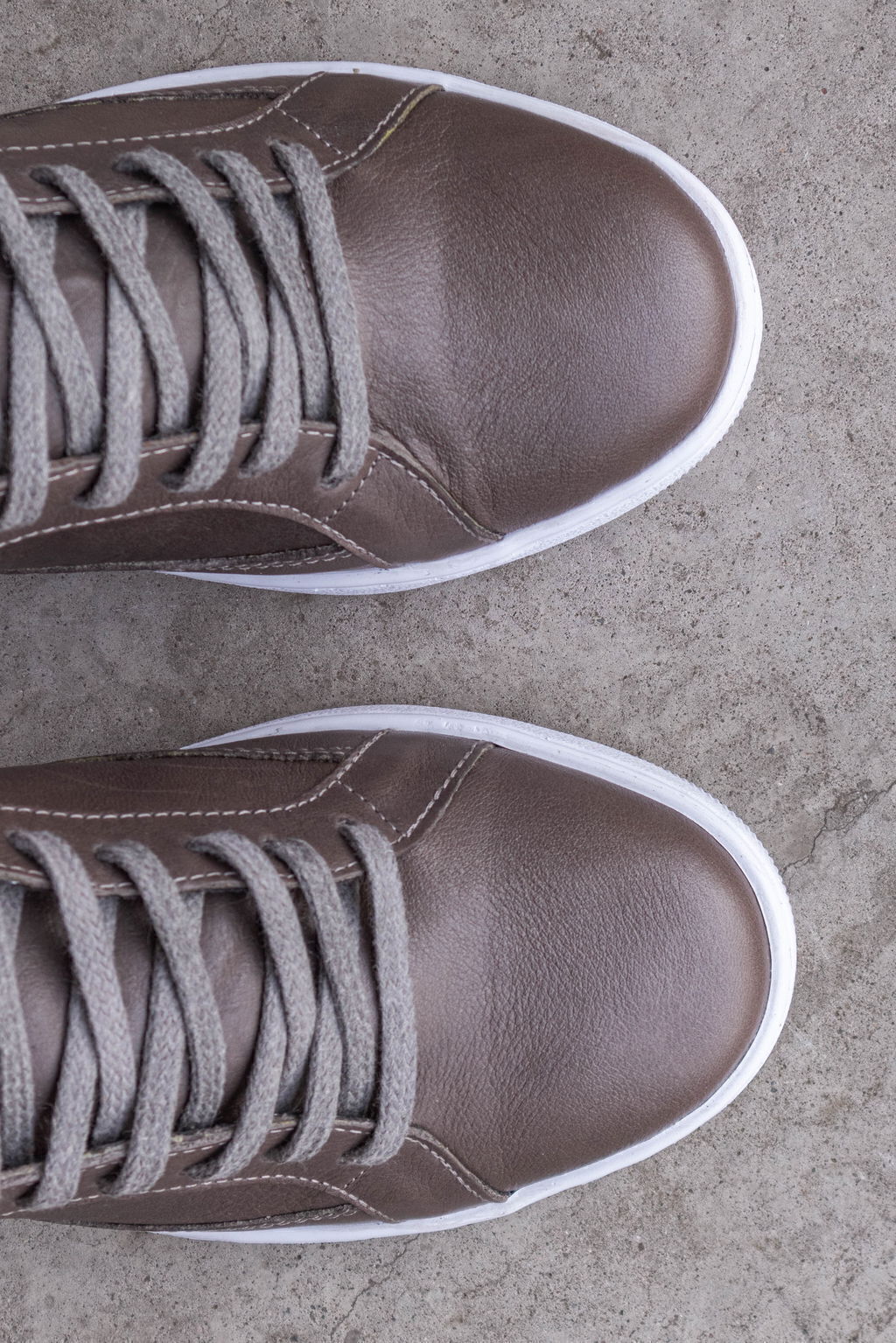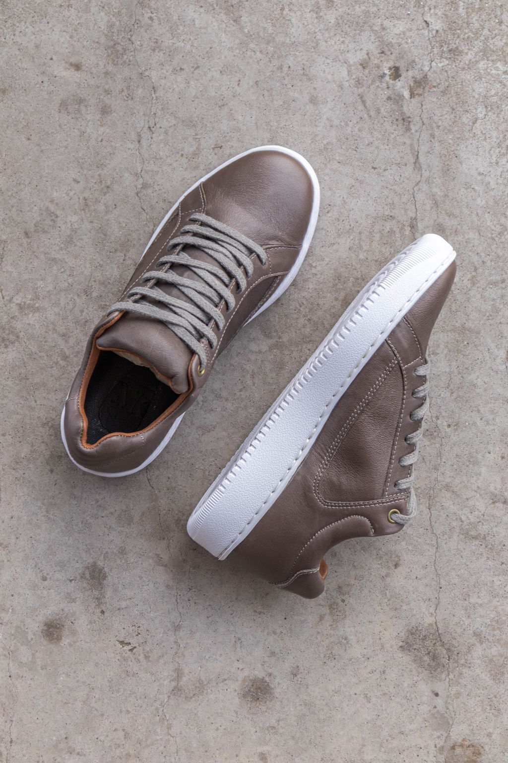 Zapatillas de capellada y forradas 100% con cuero color gris metal y planta de goma blanca.