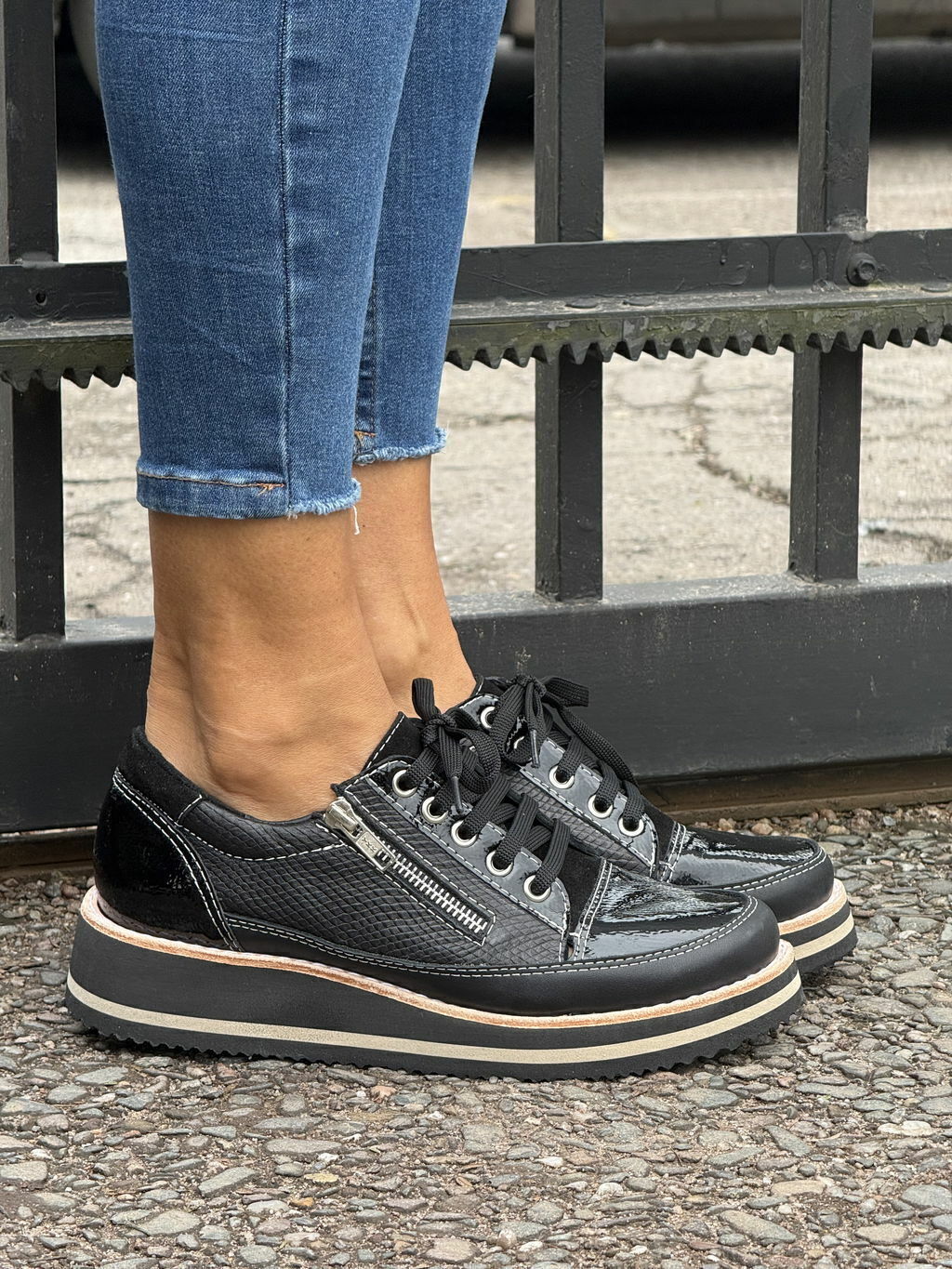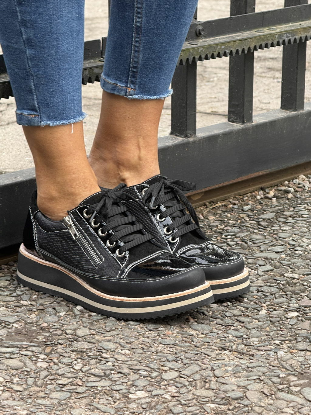 Zapatillas de vestir 100% de cuero genuino color negro en distintas texturas, cierre lateral y planta de goma negra.