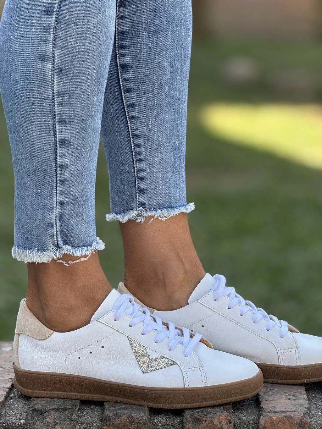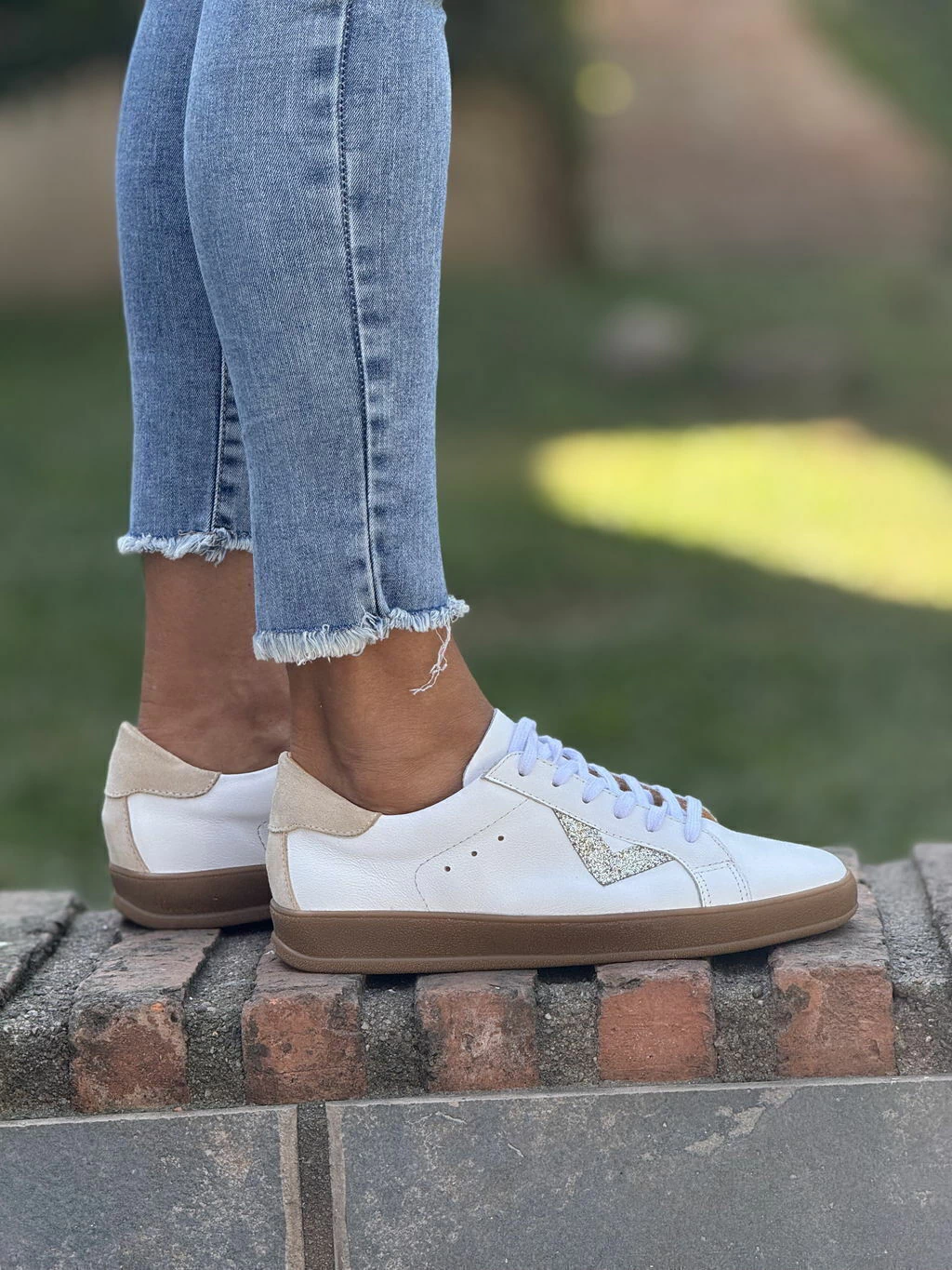 Zapatillas urbanas 100% de cuero genuino blanco y detalles con brillo, con base de goma caramelo.